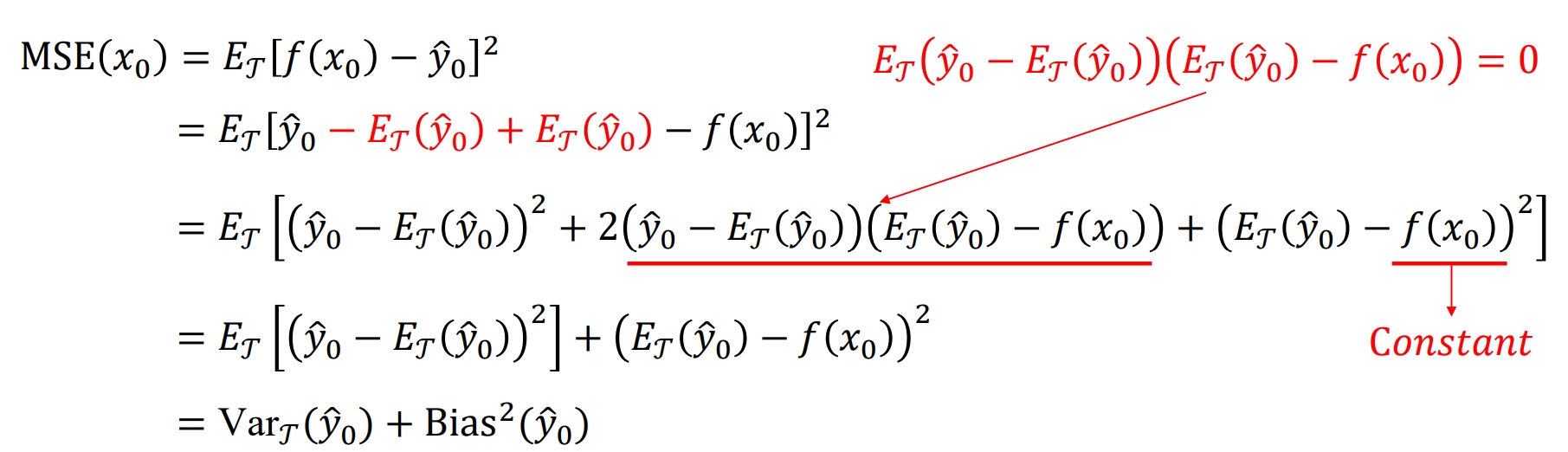 \(MSE(x_0)\) 是预测值 \(f(x_0)\) 与真实值 \(y_0\) 的均方误差,用数学期望 \(\mathbb{E}_{\mathcal{T}}\) 来平均所有可能的训练数据集 \(\mathcal{T}\)。