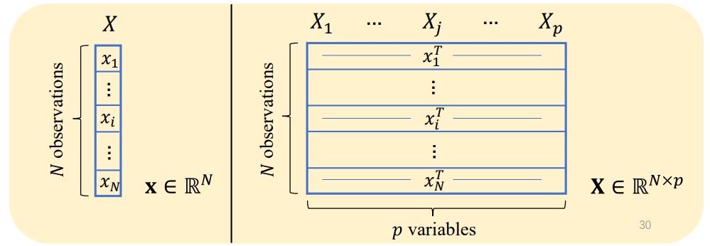 对于输入,我们通常用 \(X\) 来表示。如果 \(X\) 是一个向量(他有很多维度的特征),那么我们用 \(X_j\) 来表示它的第 \(j\) 个特征(element or variable),用 \(x_i\) 来表示观测值(observation),即每个第 \(i\) 个样本的特征的具体数值。