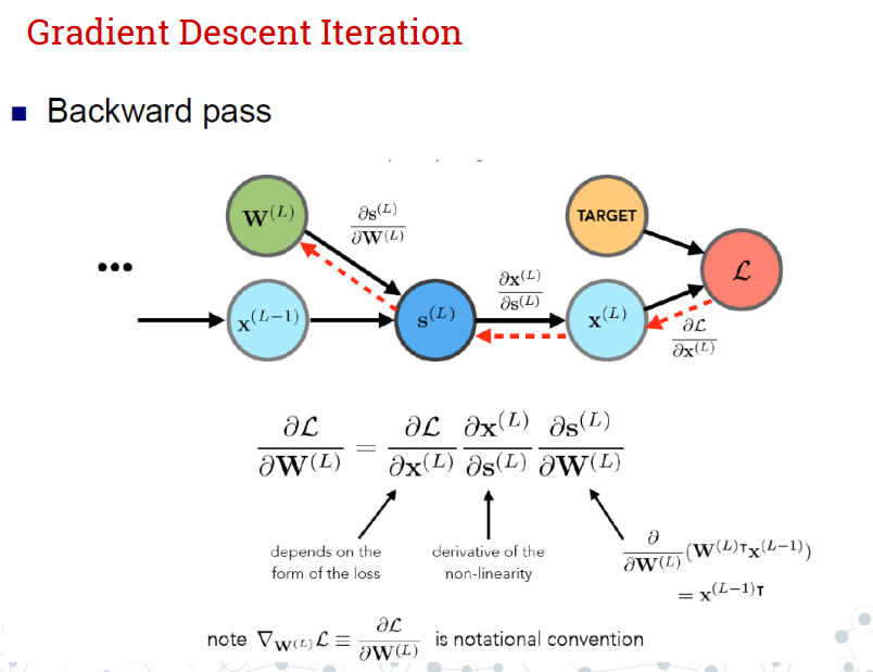 可以看出,对于每一个要更新的权重 \(W^{(L)}\),梯度的计算都需要通过前面相关项的链式法则求导得到,然后再用学习率乘梯度去进行下降。如果权重的子节点(上一层的神经网络)有多个节点,就需要对这些求导项进行求和得到。