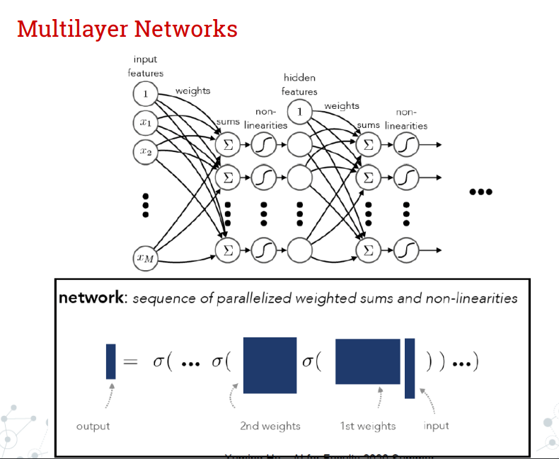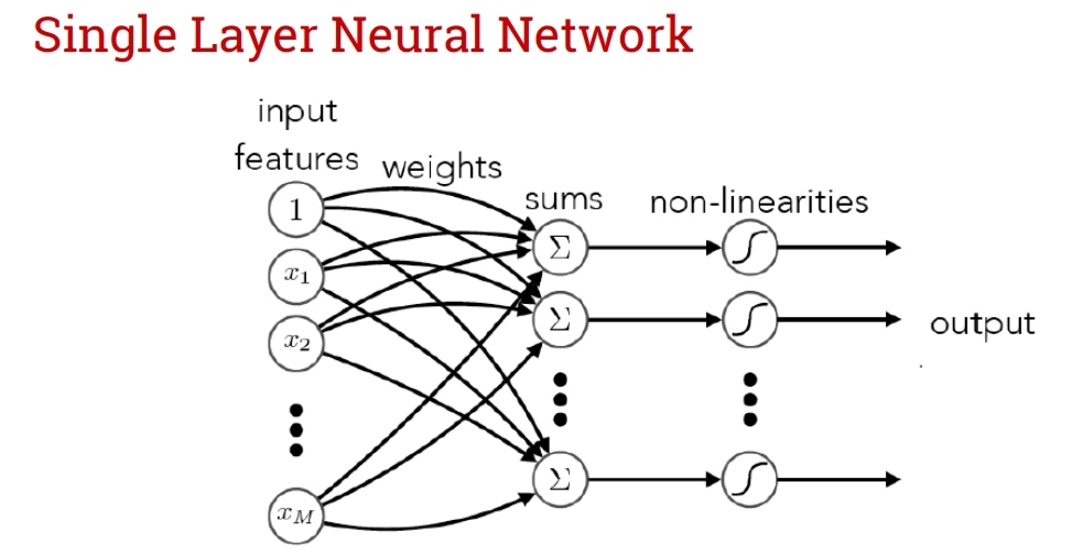 当我们把很多个神经元排列成一层的形式时,我们就得到了一个单层的神经网络,接受参数,并输出一系列经过激活函数的值。对于每一个神经元,我们都有: