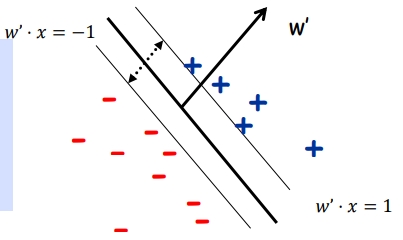 于是,问题从最大化问题被简化为了一个最小化问题:最小化 \(\|w'\|^2\),在此约束条件下:对所有的 \(i\),\(y_i (w' \cdot x_i) \ge 1\)。